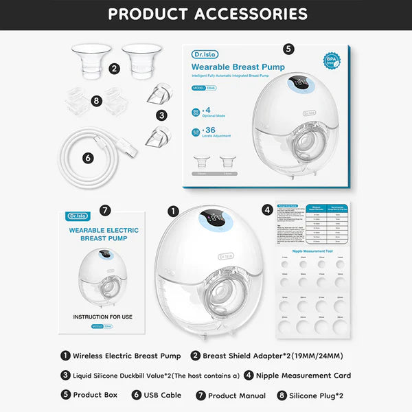 Wireless electric breast pump *1/ Breast pad *2 (19 mm/24 mm)/ Storade case/ Product box/ Certificate/ USB Tupe-C charging cable 100 cm/ Nipple measurement card/ Duck beak valve *2 (included)/ Product manual.