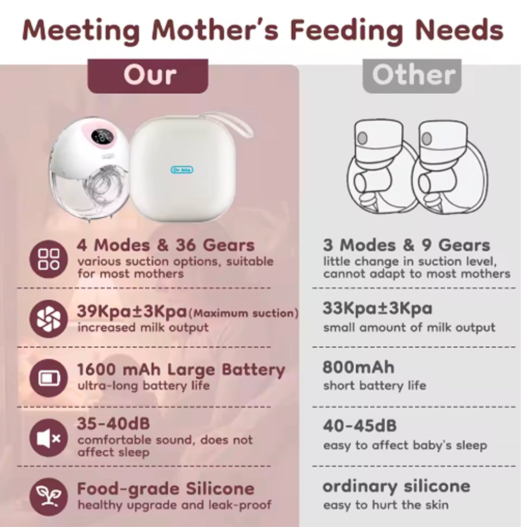 Now mom can easily go about her business, whether it's running errands, shopping or working, while leaving baby with dad or a babysitter. The Hands-Free Wireless Breast Pump gives you complete freedom of movement and works quietly and delicately. It is almost invisible under clothing, and pumping is natural and uncomfortable. It is the perfect choice for modern moms who value their time and comfort.